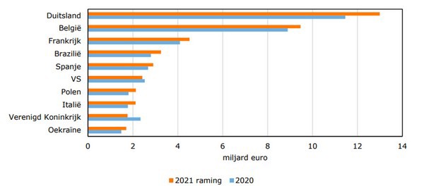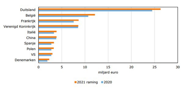 Top-10 bestemmingen Nederlandse landbouwexport in 2021 (Bron: CBS tot en met oktober 2021, raming november-december 2021 door CBS en Wageningen Economic Research)