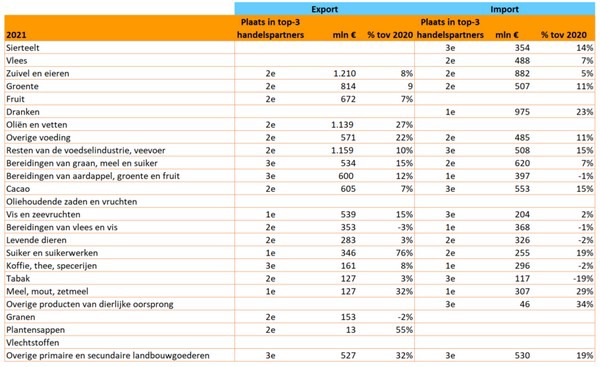 Onderstaande tabel illustreert goed het belang van België als handelspartner voor de verschillende productgroepen. Voor 76% van de productgroepen in 2021 figureert België in de top-3 van de belangrijkste handelspartners. Opvallend zijn ook de hoge groeicijfers (vaak 2-cijfer) in de Nederlands-Belgische handel van de verschillende productgroepen.