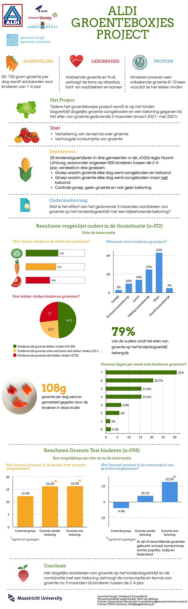 De Universiteit van Maastricht heeft het effect van het groenteboxjesprogramma onderzocht. Het onderzoek toont dat het dagelijks aanbieden van groente op het kinderdagverblijf in combinatie met een beloning voor het eten ervan, de groenteconsumptie na drie maanden significant verhoogt. “Het vele aanbieden is belangrijk, maar juist de beloning maakt van het proeven van groente ook iets leuks”, aldus promovendus Britt van Belkom, onderzoekster bij de leerstoel Jeugd, Voeding & Gezondheid van Maastricht University Campus Venlo.