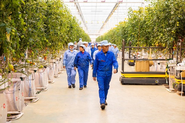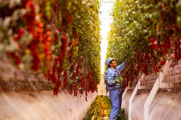 Op dit moment is het bedrijf volop in productie. Dat wil zeggen dat een er van de 5 kassen, er momenteel één draait; de andere worden de komende jaren, zodra Evergrande de bouw afrondt, in gebruik genomen. “Deze kas van 3,5 hectare is verdeeld in twee stukken”, laat Dirk zien. "Vorig jaar zijn we als trial gestart met de teelt van verschillende tomatenrassen en komkommer in de kas om te kijken hoe de lokale markt erop reageert. Uit deze trials hebben we twee succesvolle soorten gehaald. Sinds afgelopen zomer produceren we vlees- en cherrytomaten.”