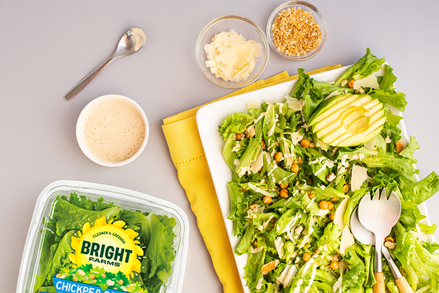 - Chickpea Caesar Crunch Kit: Deze salade bestaat uit verse BrightFarms Sunny Crunch groenten, bedekt met krokante kikkererwten, biologische quinoa, geschaafde parmezaan, knoflookcroutonkruimels en wordt gecombineerd met een veganistische Caesar dressing.