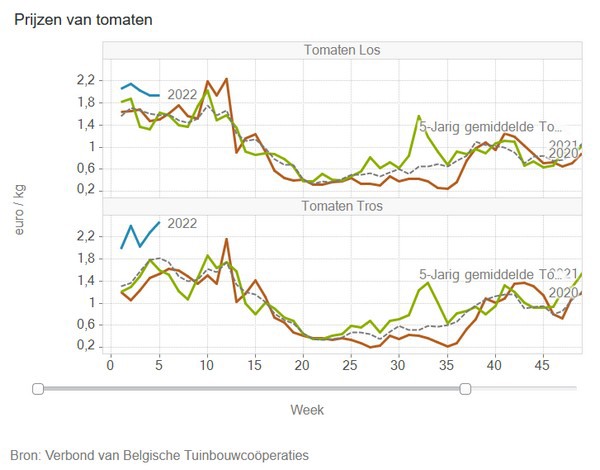 Over de eerste vijf weken van 2022 zijn ook aanvoercijfers in te zien. Die liggen vooral voor losse tomaten al weken ruim de helft lager dan vorig jaar. Ook de volumes in trostomaat liggen lager, al schommelt de aanvoer hier in aantallen iets meer.