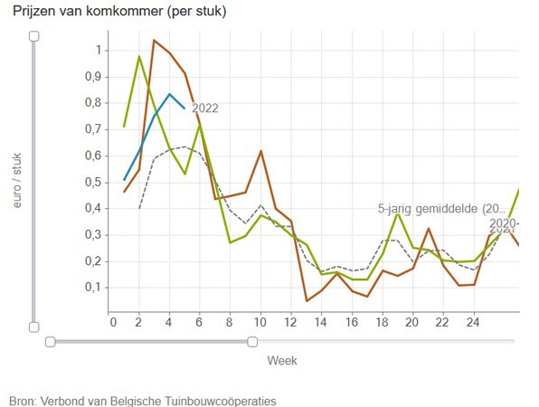 Cijfers voor komkommer ontbreken in het wekelijkse VBT-overzicht voor week 6. Stilaan komen de traditionele teelten in productie. Over de eerste 5 weken ligt de prijs ook hier boven het vijfjarig gemiddelde. Wel valt op dat ook in 2020 en 2021 prijzen bij vlagen hoog lagen. Hierdoor springen de prijzen voor 2022 minder in het oog in de grafieken dan bij tomaat.