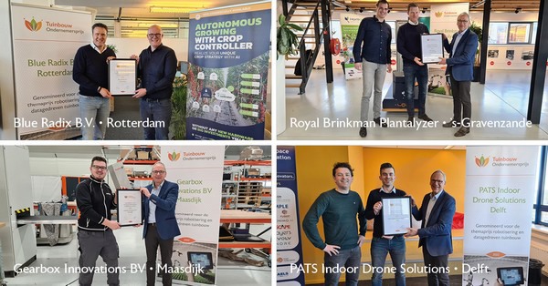 Ook voor de themaprijs Robotisering en datagedreven tuinbouw werden vier bedrijven bezocht met goed nieuws. Blue Radix, Royal Brinkman, Gearbox Innovations en PATS Indoor Drones dingen hier mee naar de prijs. Op 21 april worden de winnaars bekend gemaakt op de Floriade door minister Henk Staghouwer van Landbouw, Natuur en Voedselkwaliteit.