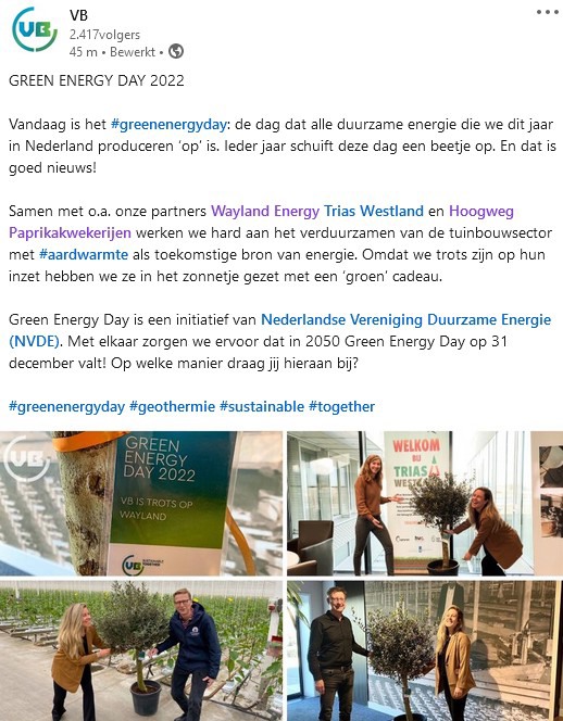 21 februari is Green Energy Day. Het is de dag dat alle duurzame energie die we dit jaar in Nederland produceren ‘op’ is. Ieder jaar schuift deze dag een beetje op. En dat is goed nieuws, aldus VB in een bijdrage op LinkedIn.