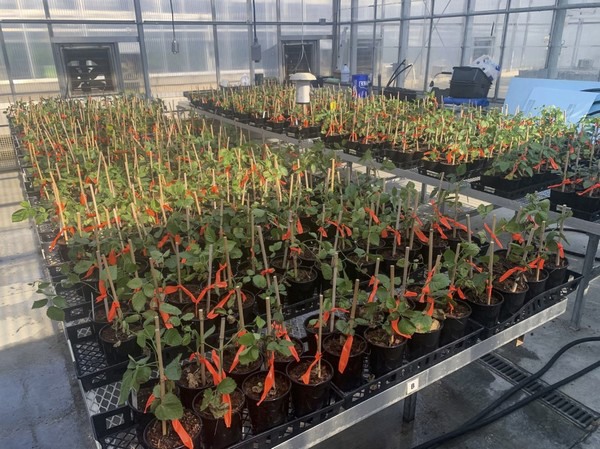 Ongeveer 30 selecties en variëteiten van het Arkansas blackberry breeding program doen mee aan de substraattest met lange ranken zonder bodemgrond in het Milo J. Shult Agricultural Research and Extension Center in Fayetteville.