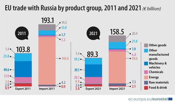 Van alle import in de Europese Unie uit Rusland ging het in 2021 voor 62% om energie, zo deelt statistiekdienst Eurostat. Dat was in 2011 nog 77%, een daling van 14,2 procentpunt.
