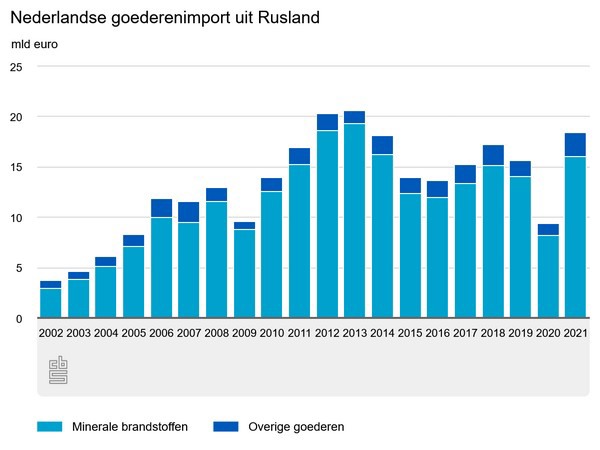 Nederland importeerde in 2021 voor 18,4 miljard euro aan goederen uit Rusland, waarvan 87 procent minerale brandstoffen (ruim de helft ruwe aardolie en verder vooral aardgas en aardolieproducten). Nederland is wereldwijd de zesde importeur van goederen uit Rusland. Dat meldt het CBS op basis van nieuwe cijfers die gaan over de periode vóór het uitbreken van de oorlog in Oekraïne.