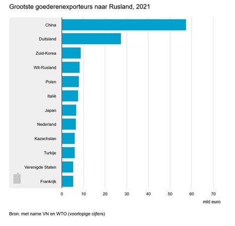 China is de grootste importeur van goederen uit Rusland. Voorlopige cijfers over 2021 laten zien dat het om een bedrag van circa 68 miljard euro gaat. Na China volgen de VS (26 miljard euro), Turkije (25 miljard), Duitsland (24 miljard) en het Verenigd Koninkrijk (22 miljard). Nederland is in 2021 met een importwaarde van 18,4 miljard euro de zesde importeur van goederen uit Rusland.