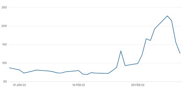 Contractprijs gas april op TTF t/m 10 maart. Klik hier voor vergroting en actuele prijzen.