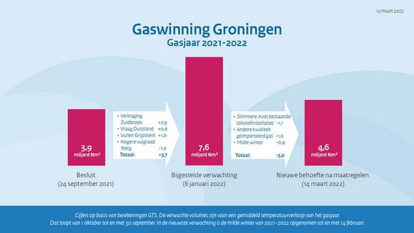 Naar alle waarschijnlijk wordt dit jaar ook de gaskraan in Groningen iets verder opengedraaid dan aan het begin van het gasjaar (oktober 2021-september 2022) was voorspeld. Vóór 1 april volgt hierover een definitief besluit. "4,6 miljard kuub uit het Groningenveld geeft genoeg zekerheid voor dit gasjaar, en de weg naar snelle definitieve sluiting van het veld, zelfs in 2023, ligt nog steeds open", aldus staatssecretaris Vijlbrief van Mijnbouw. Het kabinet blijft benadrukken dat Groninger gas in crisistijd pas in beeld komt 'als allerlaatste optie'. Men wil nog steeds in 2023 of 2024 het gasveld sluiten, al houdt men een slag om de arm vanwege onder meer de recente oorlog in Oekraïne.