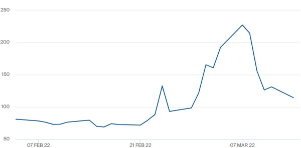 Contractprijs gas winter 2022 op TTF t/m 14 maart. Klik hier voor vergroting en actuele prijzen