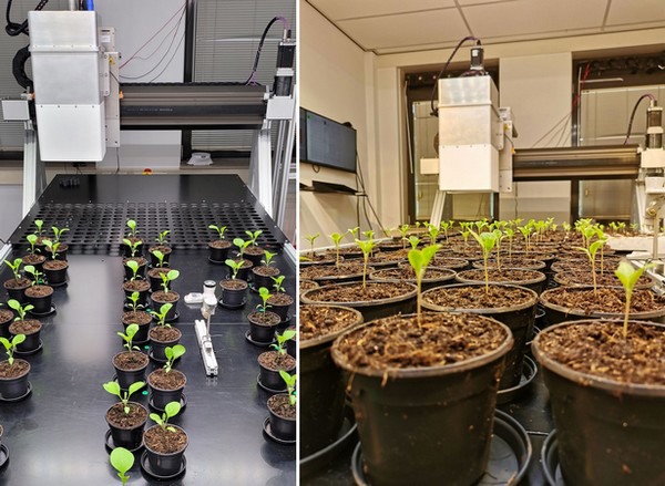 NL Research maakt gebruik van geavanceerde systemen die je nu nog enkel bij universiteiten tegenkomt, zoals XYZ-systemen. Daarbij gaat een camerasysteem automatisch over het gewas voor zeer nauwkeurige fenotypering. Op de foto bij aubergineplantjes.
