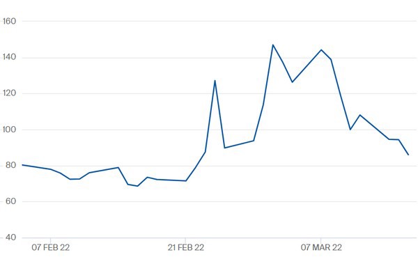 Contractprijs gas winter 2022 op TTF t/m 16 maart. Klik hier voor vergroting en actuele prijzen