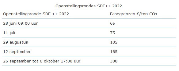 Het kabinet streeft ernaar een afbouwpad voor de subsidieafgifte aan lagetemperatuurwarmteprojecten met houtige biogrondstoffen te presenteren vóór openstelling van de SDE++ 2022, schrijft Jetten in de hierboven genoemde brief ook. Zolang dat pad er nog niet is, blijft de temperatuureis van 100 graden Celsius gelden in de SDE++ 2022.