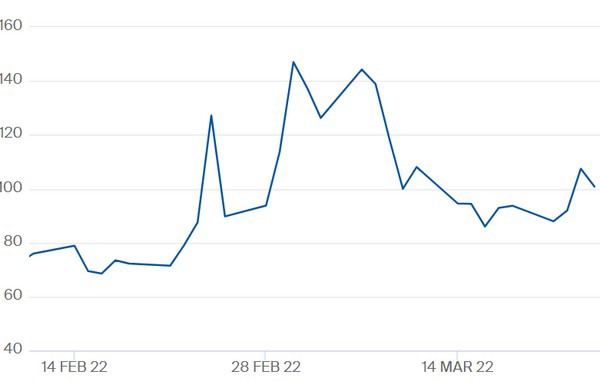 Contractprijs gas winter 2022 op TTF t/m 24 maart. Klik hier voor vergroting en actuele prijzen