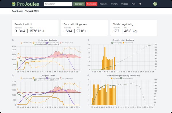 ProJoules is het modelgebaseerd gewasplanningsplatform voor de vruchtgroenten. De basis, zoals de naam al verklapt, is licht. Of beter nog, joules, de totale som aan licht in de kas op plantniveau. Het platform is in drie talen beschikbaar; Nederlands, Duits en Engels. Meerdere telers en teeltadviseurs werden betrokken bij de ontwikkeling. Dit alles resulteerde in een platform dat volgens de ontwikkelaars eenvoudig in gebruik is en de teeltplannen en realisaties duidelijk in beeld brengt, zowel in getal als in grafiek.