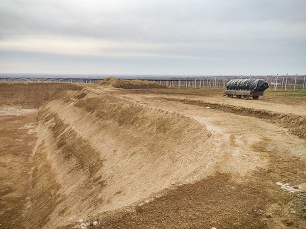 Een gegraven bassin voor een teler van blauwe bessen in Servië. De folie ligt hier klaar om geïnstalleerd te worden.