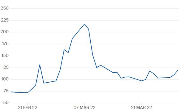 De contractprijs voor een meicontract sloot gisteren af op 119.831 euro per megawattuur op de TTF. Vanochtend om 9.00 uur lag de Intraday daggasprijs rond de 110 euro.