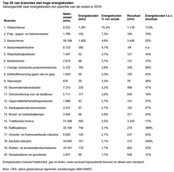 De bank rangschikt sectoren naar het percentage van de energiekosten op hun omzet in 2019. Dan staat de glastuinbouw op 1. De dunne marges in deze sector, net als in bijv. de sectoren raffinaderij en basischemie, maakt deze sectoren extra kwetsbaar volgens de bank.