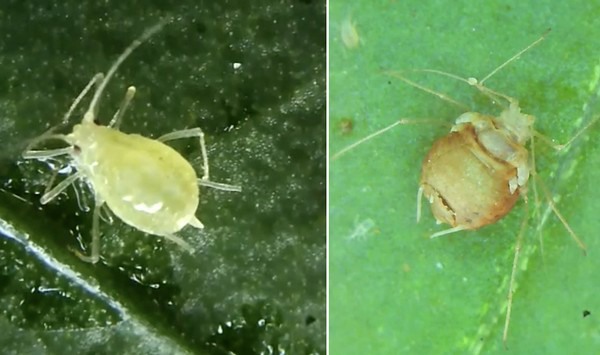 Voor (levende luis) en rechts: na inzet van Sinergy® GrowShield (geparasiteerde luis)