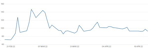 De gasprijs voor een winter 2022 op de Title Transfer Facility, het Nederlandse gashandelsplatform, tot en met 22 april. Klik hier voor de actuele gasprijzen.