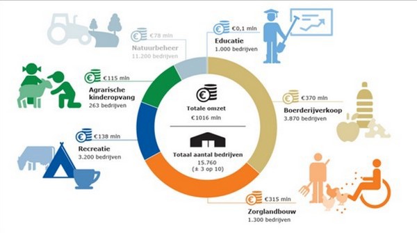 Boerderijverkoop is met €370 miljoen omzet per jaar de grootste activiteit, gevolgd door zorglandbouw (€315 miljoen) en recreatie (€138 miljoen). De agrarische kinderopvang realiseert €115 miljoen omzet, agrarisch natuurbeheer €78 miljoen en boerderijeducatie €0,1 miljoen.