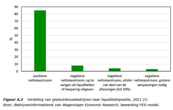 De onderzoekers bekijken in hun onderzoek onder meer de liquiditeitspositie van glastuinbouwbedrijven. Die liquiditeitspositie is van groot belang voor de bedrijfscontinuïteit op de korte termijn. Voor glastuinbouwbedrijven was de liquiditeitspositie voor de meeste bedrijven goed. In de glastuinbouw had in 2021 op jaarbasis 85% van de bedrijven voldoende financiële middelen om alle rekeningen te kunnen betalen.