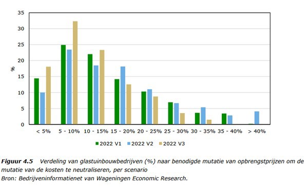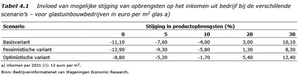 In het slechtste geval is een stijging van de opbrengsten van 15% voor 52% van de bedrijven genoeg. In het 'beste' geval voor 74% van de bedrijven. Dat betekent dat dan nog altijd ruim een kwart van bedrijven het inkomen daalt. In 2021 was het inkomen per vierkante meter glas gemiddeld 12 euro.