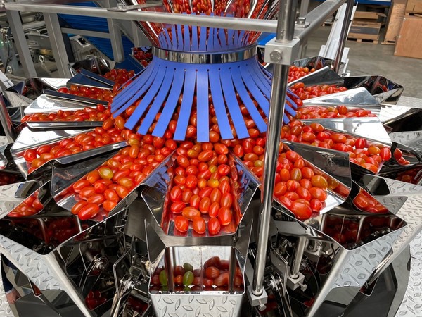 Koppert Machines levert het hele voortraject: van het wegen van de snacktomaten en het automatisch opzetten van de bakjes tot het aanvoeren van de gevulde verpakkingen naar de topsealer. ‟De tomaatjes worden handmatig of automatisch op een bufferband gelegd die ze naar een rollenbaan voert waar er nog met de hand wordt uitgesorteerd. De eerste selectie is evenwel al in de kas gebeurd, maar met de rassen van tegenwoordig zijn de snacktomaten qua maatvoering allemaal redelijk gelijk. Daarna gaan de tomaatjes naar een multihead-weger die ze in de verpakkingen doet belanden. Om de val te breken werken we met schuine platen met remflappen. De tomaatjes vallen niet echt, ze glijden naar beneden. Vervolgens is het de beurt aan de topsealer,″ legt Paul uit.