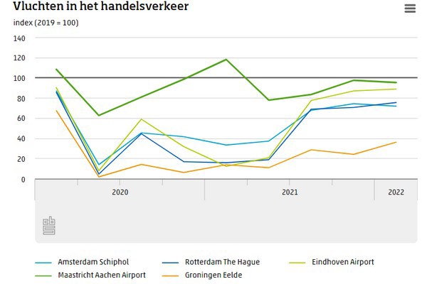 In vergelijking met het aantal vluchten in 2019 verschillen de 5 nationale vliegvelden van elkaar. Door de toename van het aantal vrachtvluchten op Maastricht Aachen Airport in 2020 en 2021 was hier de daling het laagst; in 2020 en 2021 was het aantal vluchten op Maastricht Airport respectievelijk 85 en 92 procent van het aantal vluchten in 2019. Op Groningen-Eelde nam het aantal vluchten met ruim 80 procent in beide jaren het meest af. Het aantal vluchten op Amsterdam Schiphol halveerde bijna in de twee corona-jaren 2020 en 2021 ten opzichte van 2019, maar in het eerste kwartaal van 2022 trok Schiphol 72 procent van het aantal vluchten van het eerste kwartaal in 2019.