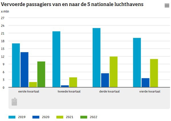 In 2018 en 2019 vonden er van en naar Nederland gemiddeld 47 duizend vluchten per maand plaats. Tijdens de coronaperiode varieerde het aantal vluchten van 4,8 duizend in april 2020 tot 37,3 duizend in augustus 2021. Het totaal aantal vluchten in het eerste kwartaal van 2022 was 73 procent van het aantal vluchten in het eerste kwartaal van 2019.