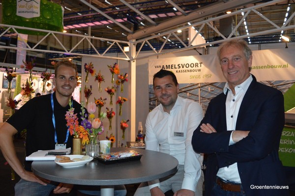 Sem Broersen van by Broersen op bezoek in de stand bij Van Amelsvoort Kassenbouw met Sven Fitters en Frank van Amelsvoort