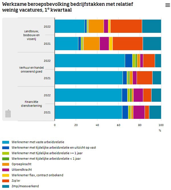 Het aantal vacatures is het laagst in de landbouw, de verhuur en handel in onroerend goed en de financiƫle dienstverlening. In zowel de landbouw als de verhuur was de werkzame beroepsbevolking in het eerste kwartaal van 2022 dan ook kleiner dan een jaar eerder. Voor wat betreft de flexibele werknemers werd in deze bedrijfstakken vooral het aandeel uitzendkrachten kleiner, met name in de landbouw. Dit aandeel nam af met 5 procentpunt.