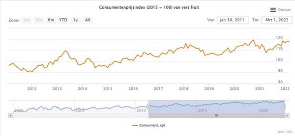 Over februari en maart stegen de voedselprijzen verder, zo meldt de WUR in haar update over de agrosector: agrimatie. De prijs van aardappelen steeg over deze twee maanden met 2 tot 3%. Verse groenten en fruit stegen met 1% in prijs. Ten opzichte van maart vorig jaar liggen de prijzen van groenten en aardappelen respectievelijk 11 en 18% hoger. De prijs van vers fruit ligt 5 tot 7% hoger dan vorig jaar in maart. Hieronder de actuele voedselprijzen van aardappelen, groenten en fruit.