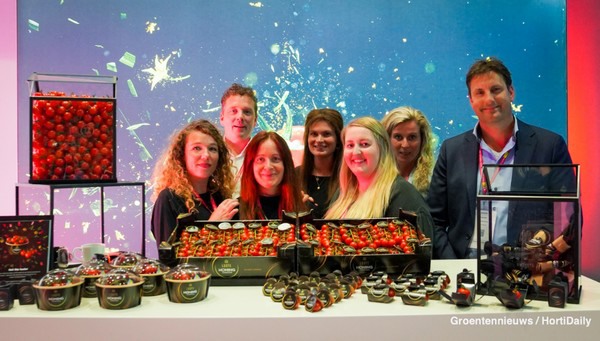 Het team van Looye bij de feestelijke uitstalling van de Honingtomaten. De combinatie met chocola werd uitgebreid gekeurd en besproken door de diverse bezoekers van het Tomato Congress. Bekijk hier de hele fotoreportage.