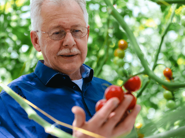 Ted Claessen van Red Nature inspecteert de tomaten in de kas.