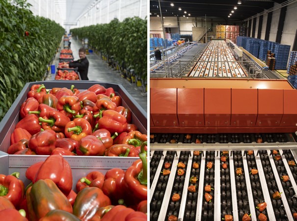 De automatisch rijdende oogstkarren geven een surrealistisch beeld in de kassen, stellend de trotse telers. Lege karren komen aangereden en de karren vol vers geoogste paprika’s vertrekken direct richting de sorteerhal. In de sorteerhal rijden zelfrijdende heftrucks die de oogstbakken naar de sorteerlijnen rijden en de paprika’s geheel automatisch kiepen. Vervolgens komen de paprika’s terecht in de sorteermachine waar 840 foto’s per seconden worden gemaakt. Op basis van deze foto’s sorteert de computer de paprika’s op gewicht, grootte en kleur en komen de paprika’s via de lopende band in de daarvoor bestemde bakken en dozen terecht.