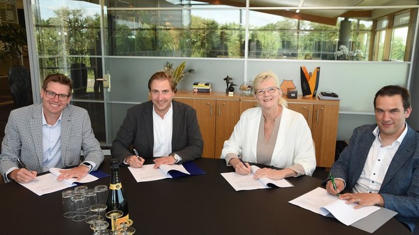 Ondertekening van de samenwerkingsovereenkomst (van links naar rechts): Pavel Prouza (Head of Controlling, Hydraulic Brake Systems, Continental), Pierre Pomper (Head of Autonomous Mobile Robots, Continental), Meiny Prins (CEO Priva) en Tom Coen (CEO Octiva).