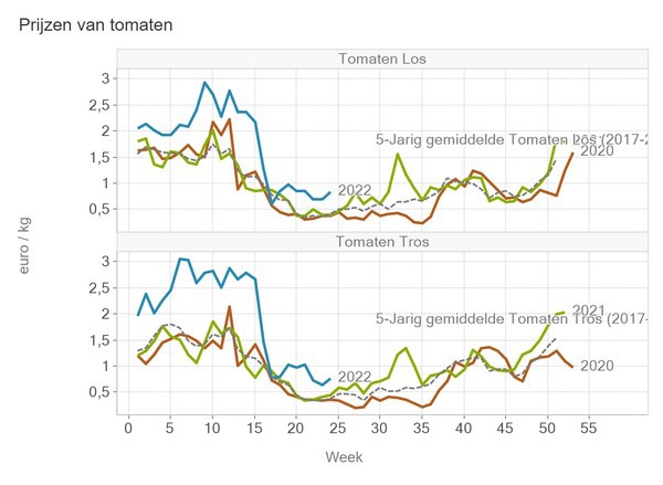 In tomaat gaan de ogen altijd ook even naar de volumes. In week 21 en 22 lagen die voor het eerst in tijden hoger dan in 2021, maar de afgelopen twee weken lagen de volumes weer een stuk lager. Voor trostomaat in week 23 bijna 30%. In week week 24 liggen de volumes dan weer wel gelijk aan 2021. Ten opzichte van 2020 blijven de volumes nog altijd achter.
