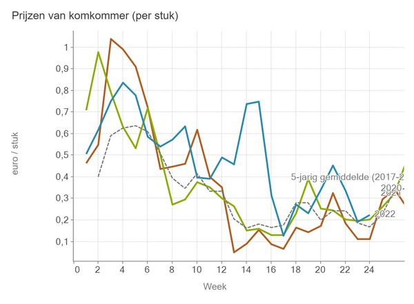 De middenprijs voor een komkommer kwam over week 24 uit op 22,5 eurocent. Een stijging ten opzichte van week 23. Datzelfde geldt ook voor aubergines (ruim 61 eurocent per kilo tegen net geen 43 eurocent in week 23) en voor tomaat.