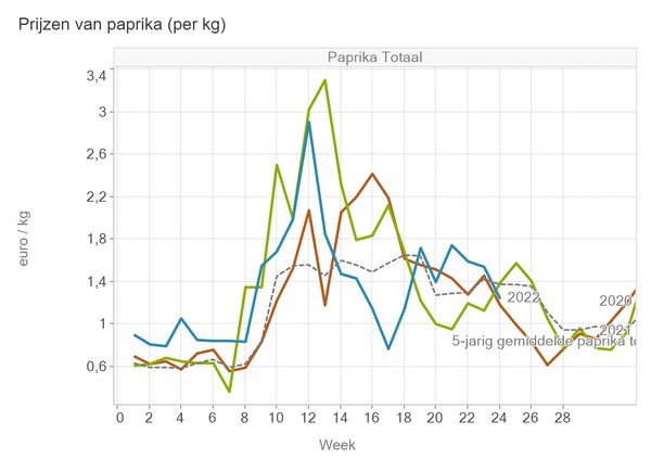 Een kilo rode paprika's leverde in week 24 gemiddeld 1,374 euro op. Een daling van ruim dertig eurocent ten opzichte van week 23. De prijs van groene paprika's leverde zelfs bijna 70 eurocent in en komt uit op 87 eurocent per kilo. De middenprijzen voor geel en oranje stegen wel, maar over de hele linie ligt de middenprijs voor paprika in week 24 onder het vijfjarig gemiddelde.