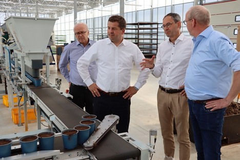 Het zaaien direct in potten gebeurt bij Bördegarten geautomatiseerd. Minister Sven Schulze (tweede van links) was onder de indruk van het kijkje achter de schermen bij de hightech kas even buiten Magdeburg. Bedrijfsleider Jos Houwen en de beide directeuren van de Wimex group Ulrich Wagner en Leopold Graf von Drechsel lichtten de details toe.