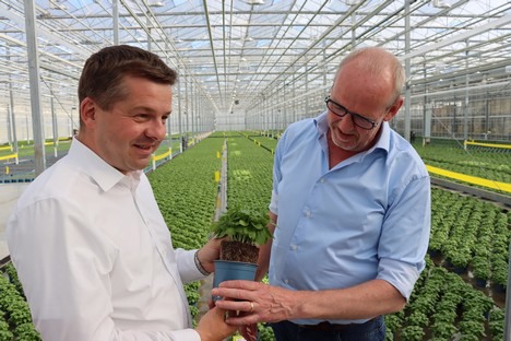 Basilicum hoort tot de kruiden die Bördegarten sinds deze zomer in bio-kwaliteit op de markt brengt. Minister Sven Schulze liet zich door bedrijfsleider Jos Houwen informeren over de bijzonderheden bij de omschakeling naar biologische teelt.