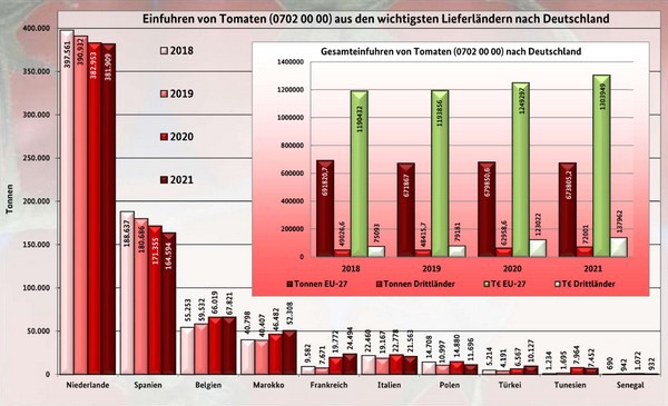 De afgelopen jaren nam de aanvoer van tomaten uit Nederland op Duitse groothandelsmarkten steeds iets af. Datzelfde geldt voor Spanje. De aanvoer uit Belgiƫ nam elk jaar juist iets toe. Ook voor Marokko geldt dat er sprake is van een aanvoerstijging, zeker in 2020 en 2021. Dat blijkt uit een BLE-rapport over de tomatenmarkt.