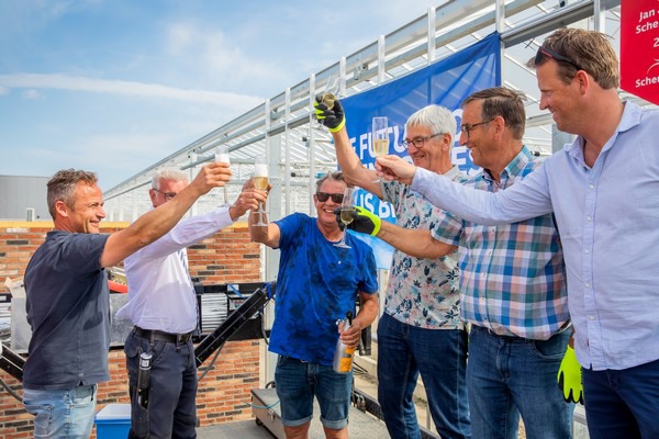 Donderdag 16 juni tijdens de bouwborrel van Kas West van Schenkeveld Schiphol hebben Jan en Peter Schenkeveld symbolisch de laatste ruit gezet in de gevel van de vierde kas op de locatie Schenkeveld Schiphol in Rijsenhout.
