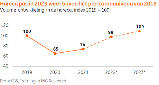 De vooruitzichten voor de horeca zijn rooskleuriger dan de afgelopen twee jaren. In tegenstelling tot vorig jaar, toen de lockdown tot mei duurde, werden eind februari 2022 vrijwel alle beperkende maatregelen opgeheven en mocht alles weer open. Voor 2022 verwachten we voor de horeca dan ook een volumegroei tussen de 30% en 35%, vertelt ING. De voorwaarde daarbij is wel dat er later dit jaar geen nieuwe lockdown voor de horeca komt. Er vindt dit jaar naar verwachting een grote inhaalslag plaats van etentjes, cafébezoek en feesten buiten de deur. Daarnaast profiteert de sector van verschillende grote evenementen dit jaar in Nederland, zoals Koningsdag, de Formule 1 in Zandvoort en de eerste drie etappes van de Spaanse wielerronde Vuelta in Utrecht en Noord-Brabant. Ondanks de sterke groei is de horecasector eind 2022 naar verwachting nog altijd niet terug op het pre-coronaniveau van eind 2019. Daar zal pas in 2023 sprake van zijn met een verwachte volumegroei rond de 10%.