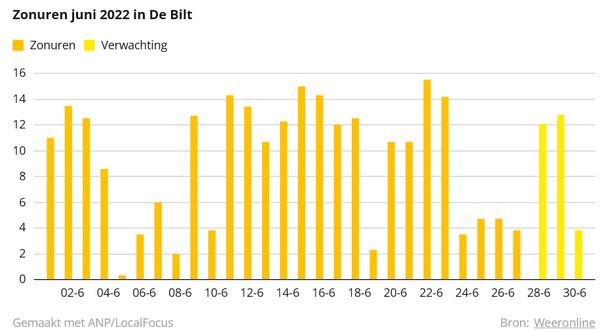 Met een gemiddelde temperatuur van 17,1 graden tegen 16,2 normaal was juni 2022 een stuk warmer dan gebruikelijk. De maand was daarnaast opvallend zonnig. De zon scheen over de hele maand zo’n 60 uur meer dan normaal. Ondanks het zonnig weerbeeld was het ook natter dan gebruikelijk. Dit kwam door enkele kletsnatte dagen, zo deelt Weeronline.