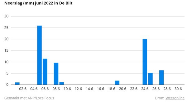 Het aantal zomerse dagen, 25 graden en meer, komt uit op vijf en dat is heel gebruikelijk voor juni. Het aantal warme dagen, 20 graden en meer, is opvallend hoog met 21 tegen ongeveer 16 in een gemiddelde junimaand.