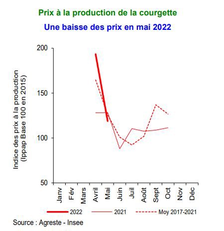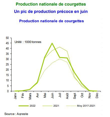 De totale oogst van Franse courgettes zou 166.000 ton bedragen, d.i. een daling met 2% ten opzichte van het vorige jaar, maar een stijging met 7% ten opzichte van het gemiddelde van de laatste vijf seizoenen. Met name in de regio's Languedoc-Roussillon (-23%) en Rhône-Alpes (-6%) wordt een daling van de oogst verwacht als gevolg van een daling van het areaal of droogteperiodes, terwijl de oogst in Provence-Alpes-Côte d'Azur, de belangrijkste teeltregio, naar verwachting zeer licht zal toenemen (+1%).